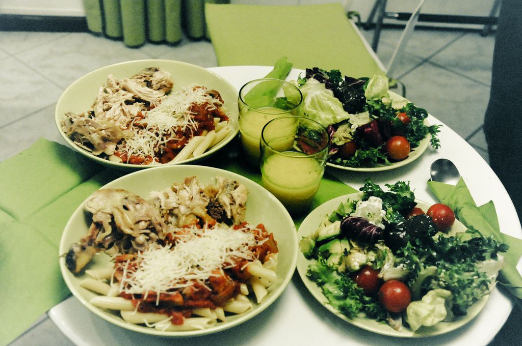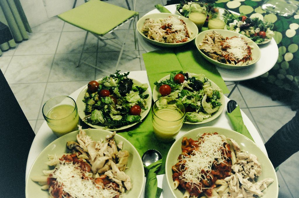 ▼ 每一個人都有兩大盤(通心麵、雞肉及生菜沙拉)跟一杯果汁